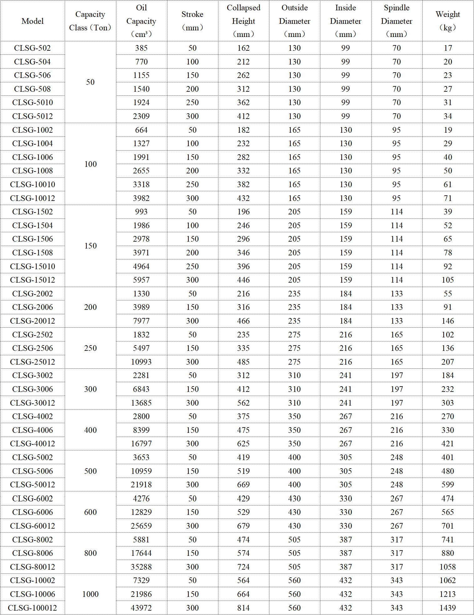 ・Collar threads included on models up to 250 ton. Optional on 300 ton and higher;